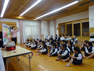 ポップコーンを作る機会に油をひいて粒を入れ、ポップコーンの歌を歌って待っていました。♪「おいしい おいしいポップコーン はじめは小さいコーンだけど、大きく大きく大きくなぁれ おいしいおいしいポップコーンできるかな?」