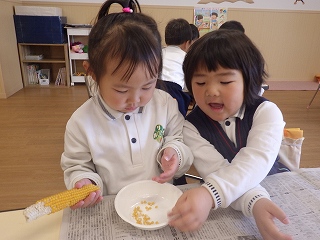 音楽会が終わったら、みんなでポップコーンパーティーをしようね♪と話をしていました。「ポップコーン好き♡でも、どうやってポップコーンを作るの?」と尋ねていました。「ポップコーンはみんながよく食べているスイートコーンではできないんだよ。ポップコーン用のトウモロコシがあるんだ。」と幼稚園の畑で収穫したトウモロコシを見せると、「カチカチだ~固い!」と言って触っていました。「この粒がトウモロコシになるのか。頑張って取ろう!」と意気込み、お友達と粒を取りました。固かったですが、コツを掴むと「取れた!」と言って喜んでいました。