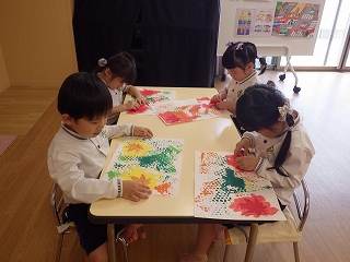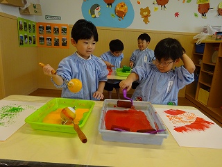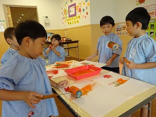 ローラーを使って自分だけの模様を付けます。友達と「何色付けよう?」「ここにも色付けたらいいかも」と話しながら楽しんでいました🖌️🎨模様を付けることが出来るように紅葉型の画用紙を貼りました🍁画用紙の上にも絵の具をのせていきます。どうなるのか子どもたちは興味津々でした。
