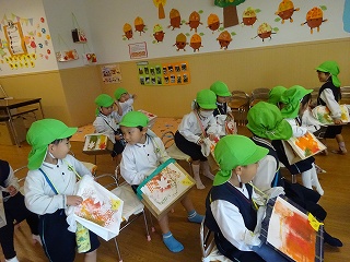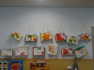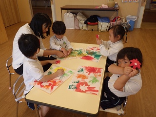 絵の具が乾くといよいよ紅葉を外していきます。「どうなってるんだろう?」とドキドキの子ども達。外すと綺麗な紅葉が浮かび上がり、「可愛い♡」と大喜びで友達や先生と見せ合う姿が見られました💕