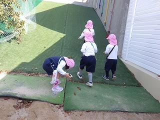 バックが出来上がると、ワクワクの子ども達から「これで遊びたい!」と声が聞こえてきたので、まずは園内で秋見つけごっこをしました。椅子を並べバスに見立てると想像力を膨らませ子どもたちは、「お願いします!」と運転手さんになった先生に挨拶をしたり、「どんぐりいっぱい見つけようね」と話したりしていました😊