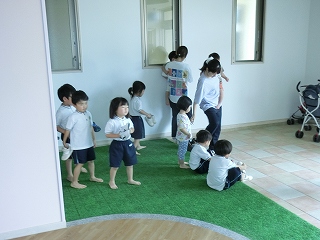 まずは、寒天棒を使いました。寒天棒の硬さや感触を知ったり、どんな匂いか嗅いでみる子がいたりしました。寒天棒をみんなでちぎっていきます。小さく小さくちぎりました。