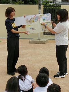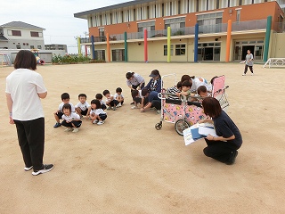 小さくした寒天を、水の中へ…しばらくすると「なんだか、ぬるぬるしてるよ!」と感触の変化がある事に気付く姿が見られました。
