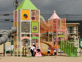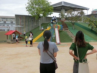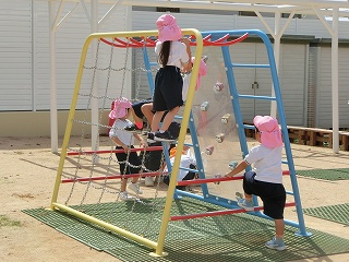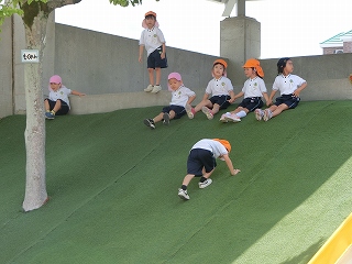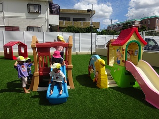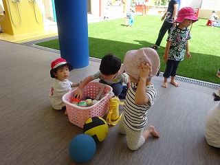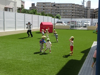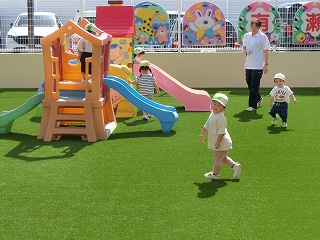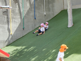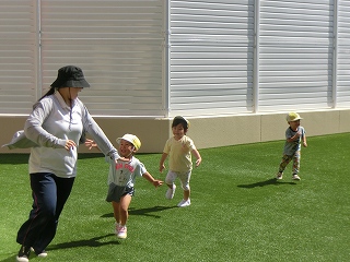 乳児さんは、芝生広場で追いかけっこです。新しいお家の遊具もお気に入りのようです。゜