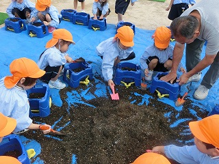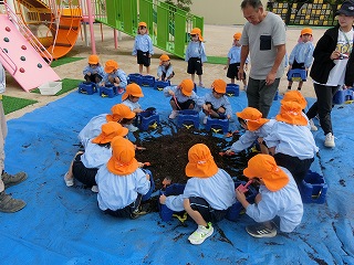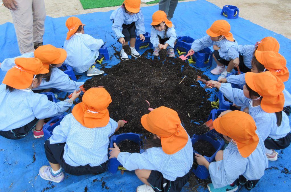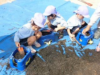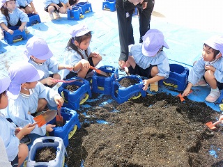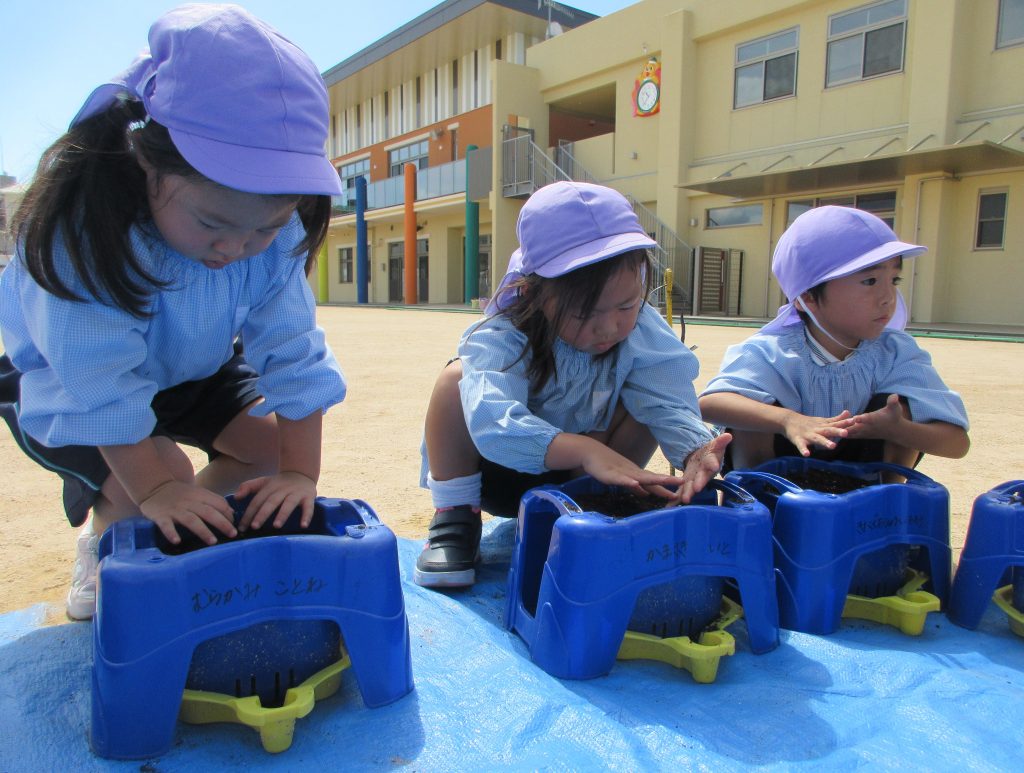 年中さんは冬野菜を育てるために、植木鉢に土を入れ、種蒔きをしました。
