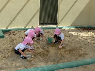 戸外で年少さんと一緒に砂場で遊ぶ様子も見られました👀砂場のお家でお店屋さんごっこをして年少さんに「これはパンケーキだよ🥞どうぞ🤲」と作った物を渡す様子や、砂場で「このコップに砂を入れて~!」「お皿にはなににする?」と上手に年少さんと話す会話が聞こえてきました🥰年少さんもお姉さん達に遊んでもらって満足そうにしていました☺️💞