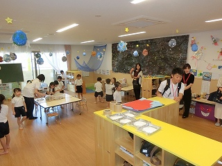 お店は、くま組がスタジオアリス、レストラン、たこ焼きやさん、ケーキ屋さん、お医者さんに決まりました。きりん組はアイス屋さん、クレープ・パフェやさん、綿あめ・ジュース屋さん、お菓子屋さん、べビタピやさんになりました。10店舗のお店作りがスタートです!!
