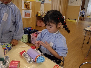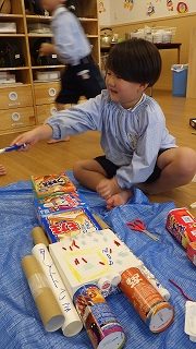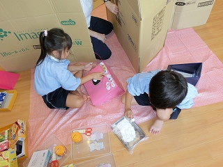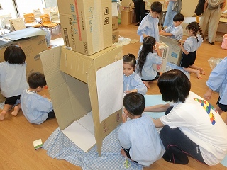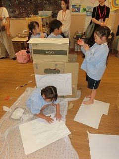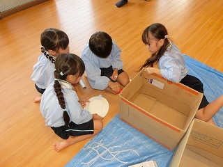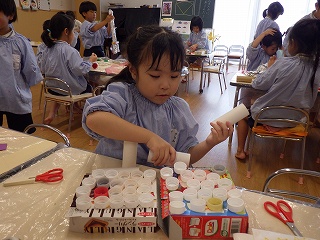 箱を何個も繋げる子や、1つの箱や筒にアルミホイルを巻く子など様々なアイデアを出し合いながら取り組む姿が見られました。組み立てる中で筒は接着しにくく、どうしたらいいんだろうという友達の声を聞いて、「ボンドをたくさんつけてたらいいんちゃう?」「〇〇ちゃんは切り込みをいれてるよ!」など解決策を出し合う子どもの姿もありました。