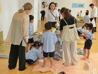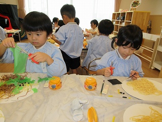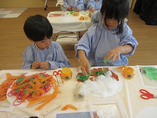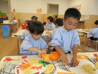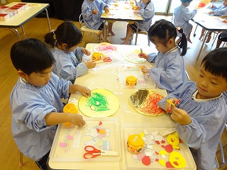 形が完成したら、パスを使って最後の仕上げです!作った作品のテーマに沿った絵を描いたり、丁寧に背景の色を塗り込んだりしました。子どもによって描く物も様々で、作りたいもののイメージを表現することができていました☆完成した作品にタイトルも付けました。一人一人に作品のタイトルを問いかけると、みんなそれぞれ楽しいタイトルを教えてくれました♫作品のタイトルは、是非参観日を楽しみにしていてください。