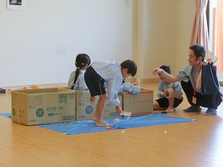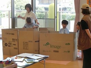 廃材コーナーから、たくさんの空き箱を持って来てロケットづくりのスタートです!
