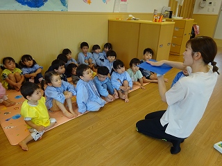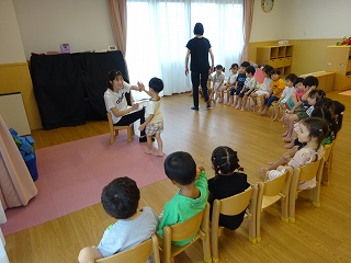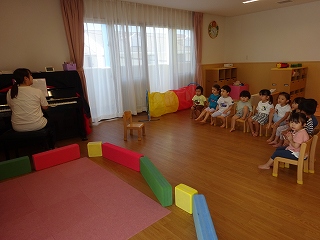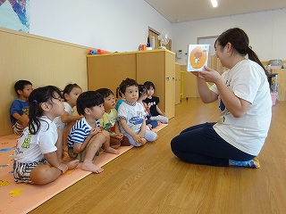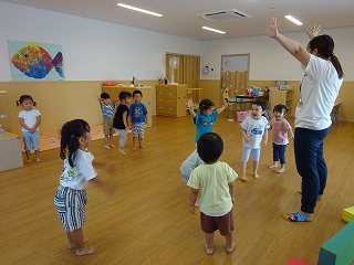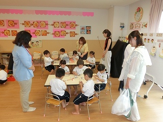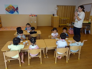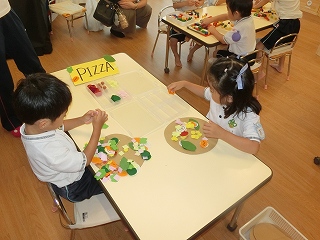 毎月読んでいる月刊絵本の内容の1つに『ピザをつくろう!』の題材がありました。みんなもピザ屋さんになってお手伝いをしようということで、まずは手を包丁にして夏野菜を切る真似をしたり、ピザ生地の上に具とチーズを散りばめ、「おいしくなあれ♪」のおまじないをかけたりしてピザ屋さんごっこを楽しみました。