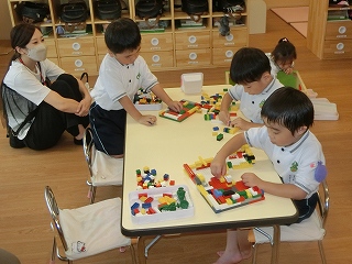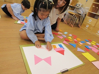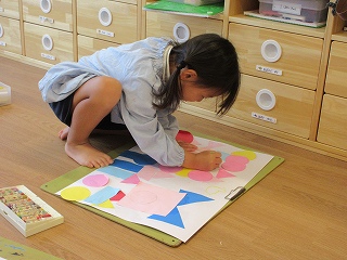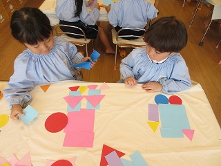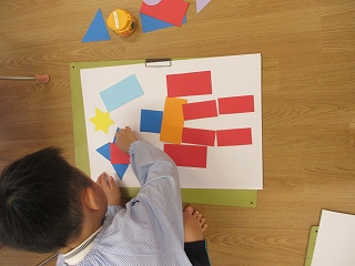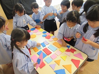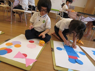 まずは、使いたい形を選びます。形はもちろん、大きさも様々なので子ども達もとても悩んでいました。「何枚選んだら良いかな?」と友達と相談したり、「三角を2枚使ってダイヤの形ができた!」と見付けた形を教え合ったりしていました。始めは並べるだけだった子ども達も、重ねたり組み合わせたり、遊び方の幅が広がっていきました。
