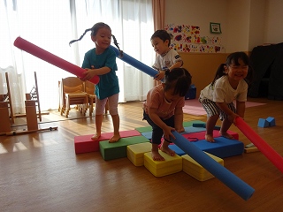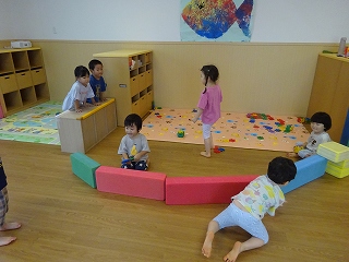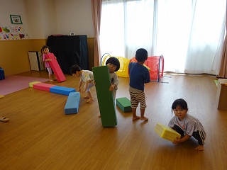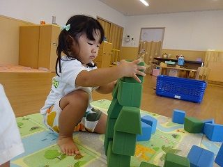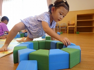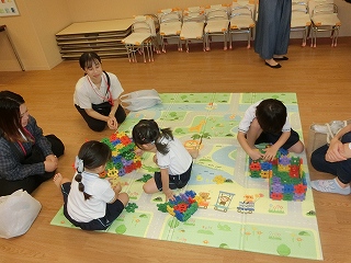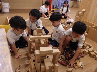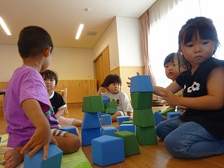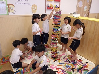 制作コーナーのほかにも遊びは広がっています。1学期から遊んでいた積み木コーナーは複雑な形の建物が日々できあがっていました!!