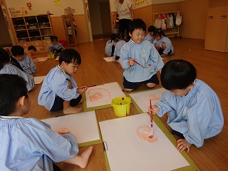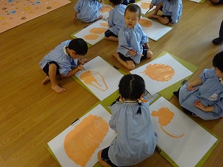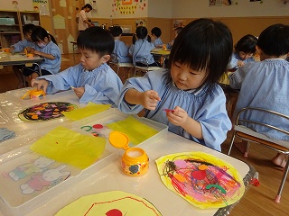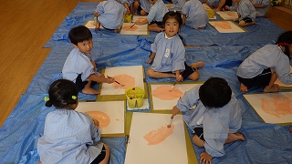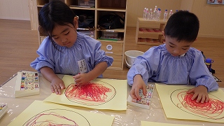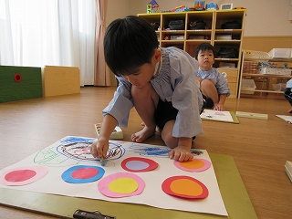 絵画制作2回目は顔を描くことに挑戦しました。肌色の絵の具で大きな丸や中くらいの丸を何個か描き、塗り込みました。丸を描くことはできるようになってきましたが、中を塗り込むことには苦戦する様子が見られます。しかし、1つできると自信になり、満足そうにする姿や、もう1回描いてみようと2つ目の丸に取り掛かかろうとしていました。