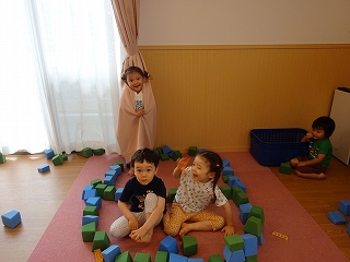 大型ブロックをコーナー遊びに用意すると、「大きい猫ちゃんの家を作ろう!」と家をを作っていました。「ピンポーンしてください」と一人のお友達が声を掛けると、続々と一緒に遊びたいお友達が集まってきました。