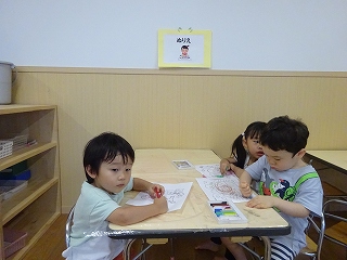 静のコーナ遊びではペットボトルに色のついたストローを入れてジュースを作る子どもや、パスや色鉛筆を使って塗り絵を楽しんでいる子どももいますよ🌟
