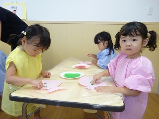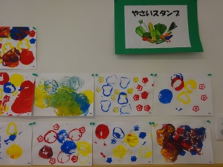 スタンプ遊びや制作遊びでは、絵の具やのりが手に付くことが少し苦手だった子どもも、少しずつ自分から取り組むことができるようになってきました!そして、制作物が完成した時には、とびっきりの嬉しそうな表情を見せてくれます♫