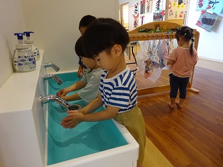 9:00 順次登園、身辺整理(タオルをかけたり、エプロンやシール帳を所定の場所に置いたり、全て自分で用意をしていきます。)