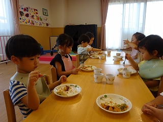 11:30 給食 (苦手な野菜を頑張って食べようとする子どもが増えてきました♡)