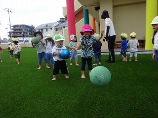 ボール遊びでは、裸足になって芝の園庭でボールを追いかけたり蹴ったりして、元気いっぱい駆け回りました!とんぼが飛んでいるのを見て、『とんぼいるね~!』と、朝の会で歌っている”とんぼのめがね”を口ずさむ子どももいました♫✨その後、滑り台で遊んだり走り回ったり、まだまだ元気いっぱいの様子でした!外で体を動かすのは、とっても楽しいね💕少しずつ過ごしやすい気候になってきているので、たくさん戸外遊びをしていきたいと思います⭐