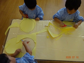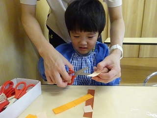 そして、ハサミにも挑戦!!少人数ずつ、ハサミの持ち方や切り方を伝え、一緒に画用紙を切りました。真剣な表情を浮かべながら取り組み、とても美味しそうなカレーライスが出来上がりました🍛✨