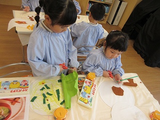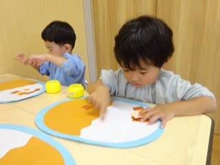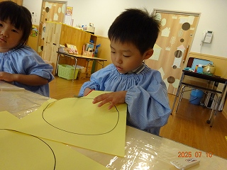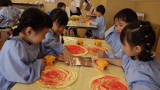まずはピザ生地作り!画用紙に大きく描かれた丸をハサミで切り、ソースはパスで塗り込みました。初めて自分の手よりも大きな画用紙を切ることや丸を切ることにドキドキし、慎重に取り組む姿が見られました。切りすすめていくうちに、ハサミだけを動かしても切れないことが分かったようで、画用紙を持ち替えながら切る姿が見られました✂…