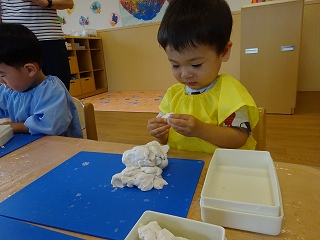 粘土では、大きな塊を重ねたり、小さくちぎったりして、粘土の感触を楽しみました💙お友達や先生とお話することを忘れるくらい、とても集中して取り組む姿が見られました☺!またゆっくりと粘土遊びを楽しみたいと思います✨
