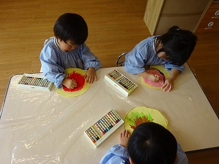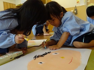 鏡で顔を確認したら、いよいよパスでパンケーキ(肌色の丸)を顔にしていきます。パスの持ち方に気を付けながら描いていきます。鏡を見て気付いたことを絵に表現するためには試行錯誤する子どもたちの姿が見られました✨