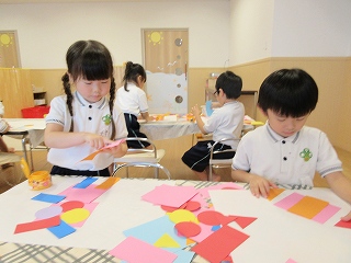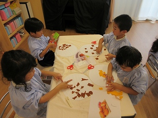 作りたいものをイメージして材料を選び、丁寧に並べて貼っていきます。作っていく過程で「紙を動かしてたらこんな形になった!」「ここどうしたら良いかな?」と友達や先生と相談しながら作りました。みんなそれぞれイメージを膨らませて、素敵な作品が作られていきました。子どもたちの想像力は豊かで、どんどん面白い作品が出来上がっていきました。