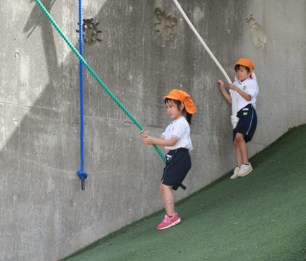 山滑りでは、戸外遊びに行くと皆1回は滑って遊ぶほどの大人気!🌟手を繋いで横一列になって滑ったり、電車になって繋がって滑ったりと滑り方は様々🤭山滑りの横の壁には、ロープで遊ぶところがあります!ターザンのようにして遊んだり、壁を使って登ったりと楽しく遊んでいました!これからも、危険がないように注意しながら見守っていきたいと思います🙂↕️