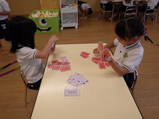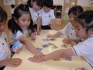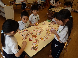 ほかにカード遊びのコーナーを新しく作りました!!かるた遊びでは、先生が読み手をしていましたが、子どもからやってみたいという声があり、ひらがなが読めるお友達が読み手となり、遊びを楽しんでいます。