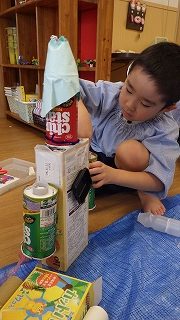 2学期に入り、廃材を使ってロケット制作を行いました。各ご家庭で、たくさんの空き箱やカップ等をご用意していただき本当にありがとうございました。