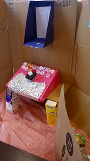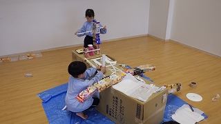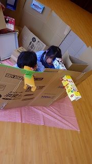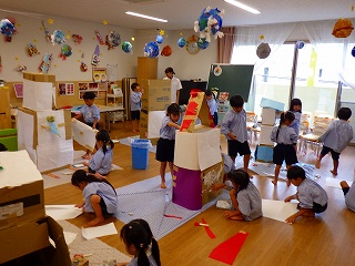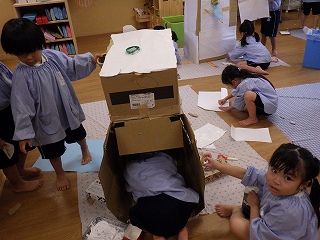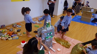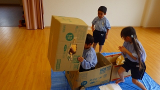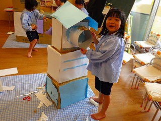 箱を何個も繋げる子や、1つの箱や筒にアルミホイルを巻く子など様々なアイデアを出し合いながら取り組む姿が見られました。組み立てる中で筒は接着しにくく、どうしたらいいんだろうという友達の声を聞いて、「ボンドをたくさんつけてたらいいんちゃう?」「〇〇ちゃんは切り込みをいれてるよ!」など解決策を出し合う子どもの姿もありました。