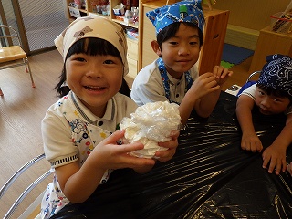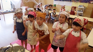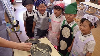 最初に、団子の作り方を知りました。だんご粉に豆腐を入れて揉む事を知らせると「豆腐!?」「それって、美味しくなるの?」と不思議そうにしている子がたくさんいました。