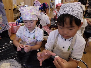 だんご粉がしっかりと一つにまとまったら、小さくちぎって丸めます。大きさの違いや数などを意識しながら、丁寧に丁寧に丸める様子が見られました。