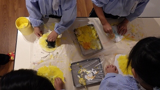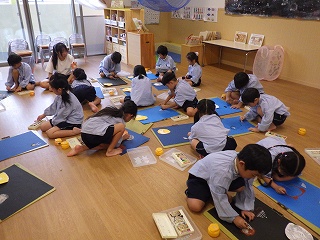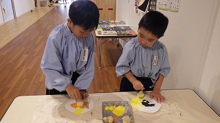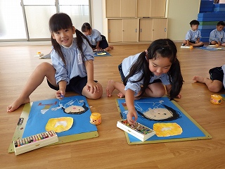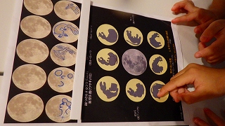 クッキングの翌日には、お月見の制作をしました。月刊絵本に載っていたお月見のページや写真などを事前に見ながら、お月様の中には何が見えるだろう…と考えて自分なりの月をステンシルしました。