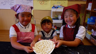 10月6日のお月見に向けて、お月見団子のクッキングを行いました!エプロンを付ける際には、友達同士で協力し合う様子が見られました。