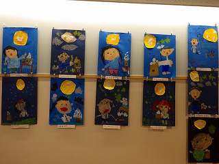 出来た満月を画用紙に貼り、お月見をしている自分を描きました。だんごを飾っている所を描く子もいれば「みたらし団子食べてもいい?」と聞いて描く子もいました。