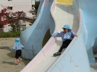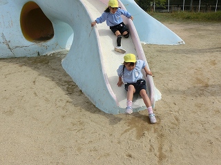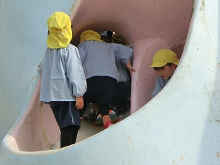 今回の交流では、戸外遊びとコーナー遊びを行いました。遊び始めはお互い様子を伺っていましたが、誘い合いながら遊びを始めました。戸外では築山で遊ぶ子どもの姿が見られました。「一緒に滑ろう!」「せーの!!」と賑やかな声が聞こえてきましたよ♫