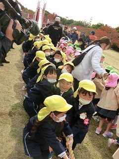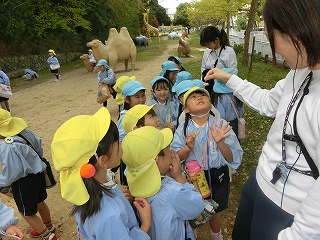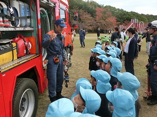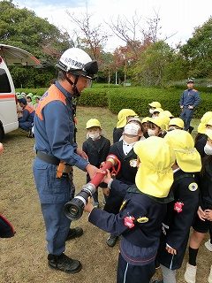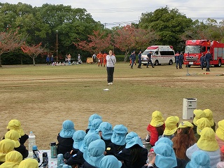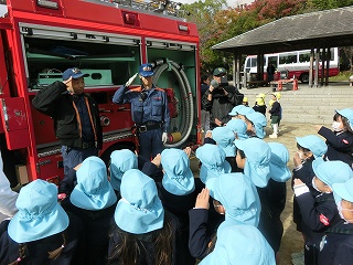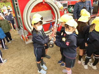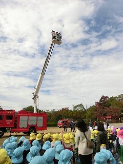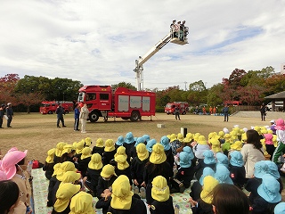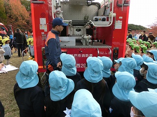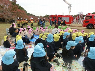 11月13日に年長さんが「防火の集い」に参加してきました。西区の9つの幼稚園が西神中央公園に集まり、西消防署のみなさんに消防車やはしご車、救急車などの実車を見せてもらいながら説明をしてもらったり、ゲームをしたり、消防音楽隊の演奏を聞かせてもらったりと楽しい時間を過ごしました。日々の消防署員のみなさんの優しさとたくましさを感じることもできました。
