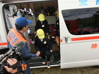公園に到着すると、会場に止めていたいろいろな車両を見て回りました。救急車に乗せてもらい、ベッドがあることに納得の表情でした。また、放水するホースの先を持たせてもらうとその重さにびっくりしていました。