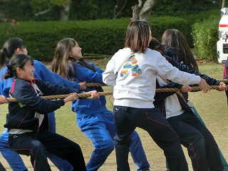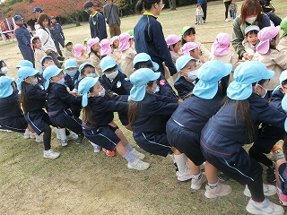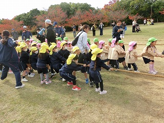 永藤先生の司会で集いが始まりました。まず、消防車との綱引きです。そして、なんと勝利です。ちなみに、先生たちも勝ちました。みんな大喜びでした。