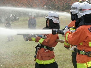次は先生による幼稚園対抗防火服着替え競争です。宗佐先生が代表で出場しました。子どもたちの応援でとても早く防火服に着替えることができました。放水訓練にも参加しました。