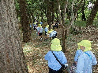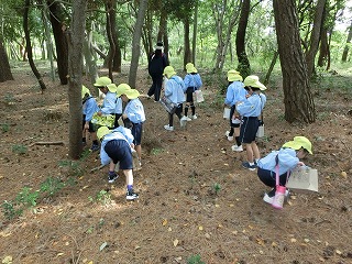続いては、どんぐり集めです。いろいろな形のどんぐりを見つけては報告に来てくれます。「長細いのはがあったよ。」「太っちょのどんぐりだよ。」「帽子もかぶってるよ。」と色々見つけて、その特徴を伝えることができていました。