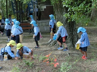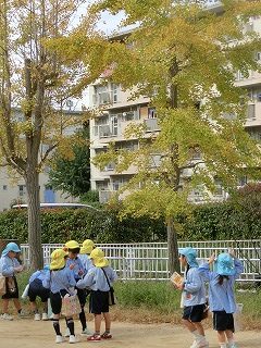 イチョウの実を見つけたので、「匂ってごらん。」と先生からすすめられた子どもたち。「うわぁ。」と顔をしかめていましたが、それも学びですね。