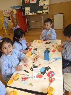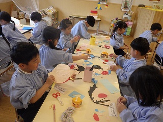 テーマは「いちごを食べている自分」です。フリーハンドで、自分の顔のパーツを描いたり切ったりししました。「大きな口を開けて食べたよ!」「歯も作ろう!」「帽子も被っていい?」「コップに入れていちごを食べたよ。」など、子どもたちは体験したことを思い出して制作していました。