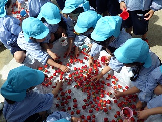 真っ赤ないちごがたくさん採れました🍓みんなで洗います。