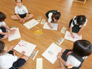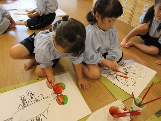 丸と四角の形を見て、「何に見えるかな?」をテーマに絵を描きました✎1回目は丸を使って、顔やアンパンマン、ドーナツなど思い思いの絵を上手に描いていました♫「何を描いたの?」と聞くと自分でタイトルを考えて教えてくれました!2回目は四角を使って描きました。丸と違ってイメージをすることが難しい形でしたが、お家やロケット、水族館などしっかり考えて描くことができました⭐みんなとても素敵な作品に仕上がりました☺2学期からも、子どもたちの楽しいブームを作っていきたいと思います!