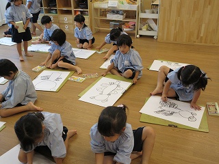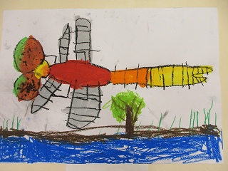 トンボの目の形や体の形、「トンボには強い顎があるよ!」「羽根はあみあみだった」と次々得た知識を発表してくれました♪そして黒色のパスを使って、まずはトンボの形を描きました。友達と石ヶ谷公園に行った時の思い出を話しながら、楽しんで絵画に取り組む様子が印象的でした💓パスで描いた後はいよいよ絵の具で色塗りです🎨