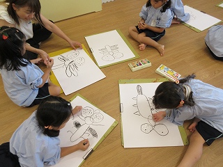 各班に観察できるようだんごむしを用意し、制作を行いました。じーーーとだんごむしを眺める子どもや「このだんごむしどっか行かないかな?」とだんごむしが気になってしょうがない子どもたち💦手が止まることも多々ありましたが、だんごむしを上手く描いていました!